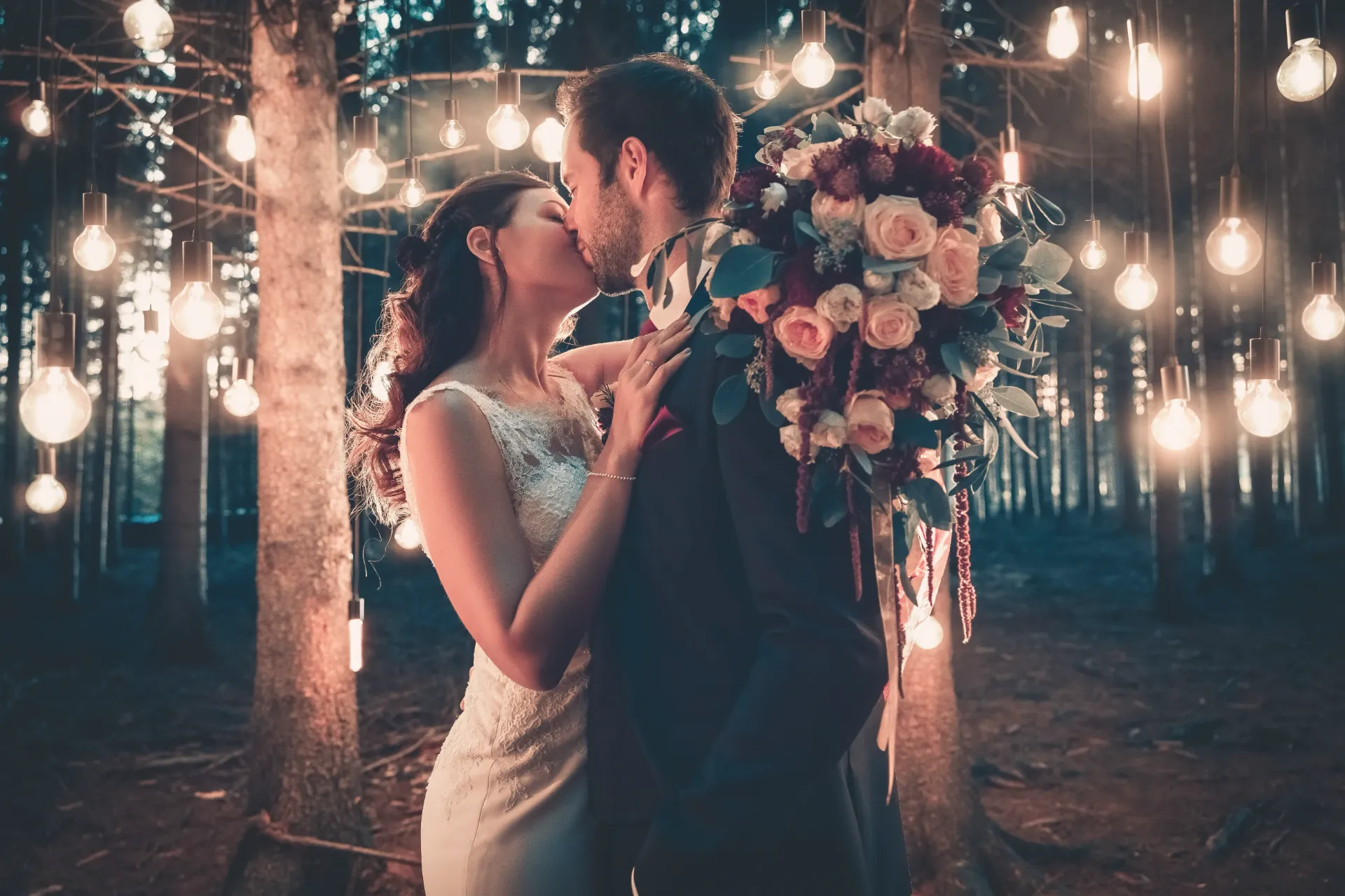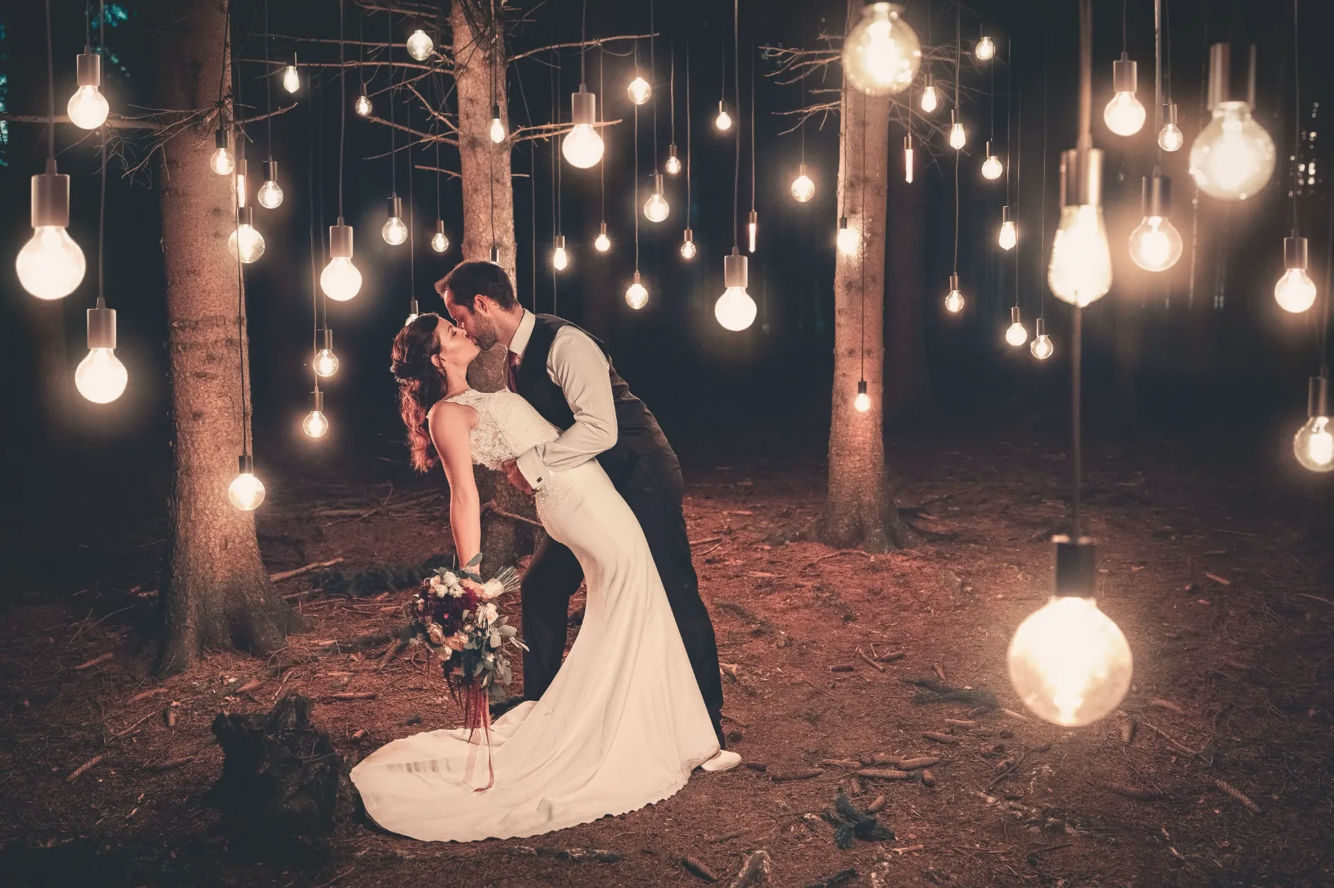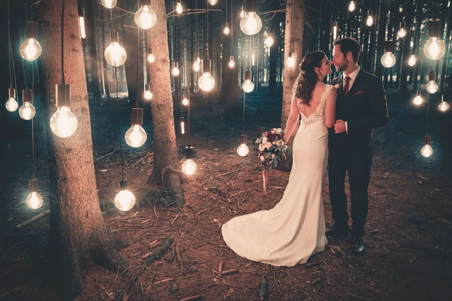 Das Ergebnis war atemberaubend. Die warmen Lichter der Edison-Glühbirnen schufen eine romantische und fast märchenhafte Atmosphäre im Wald. Caro und Gerhard passten perfekt in dieses Setting und brachten mit ihrer natürlichen Ausstrahlung und ihrem Charme die Szenerie zum Leben.