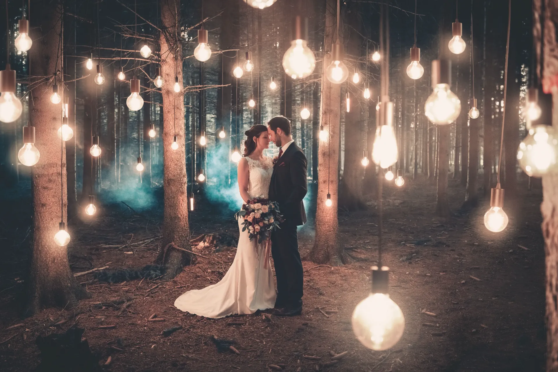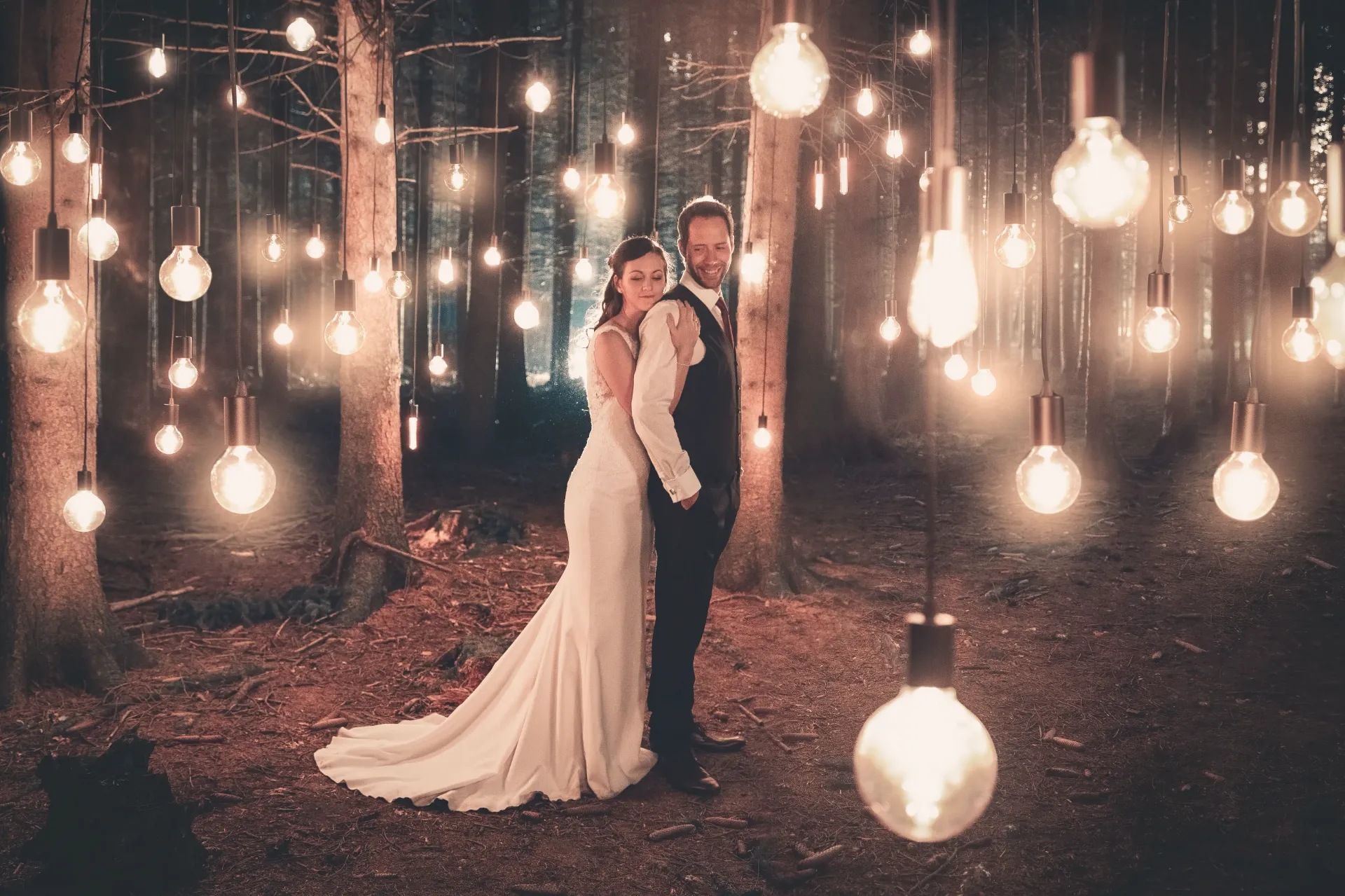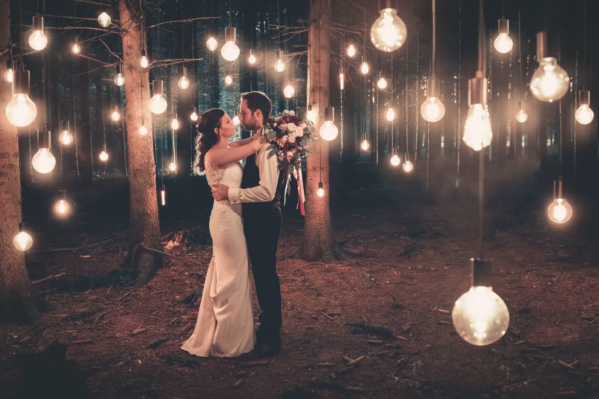 Für unser Shooting mit Caro und Gerhard wollten wir ein surreales Setting erschaffen, das mit seiner Magie und Einzigartigkeit verzaubert. Die Idee war, mitten im Wald ein Ambiente mit Edison-Glühbirnen zu kreieren. Diese Vorstellung erforderte mehrere Stunden Aufbauarbeit von unserem Team und viel Vorbereitung, um den gewünschten Effekt zu erzielen.