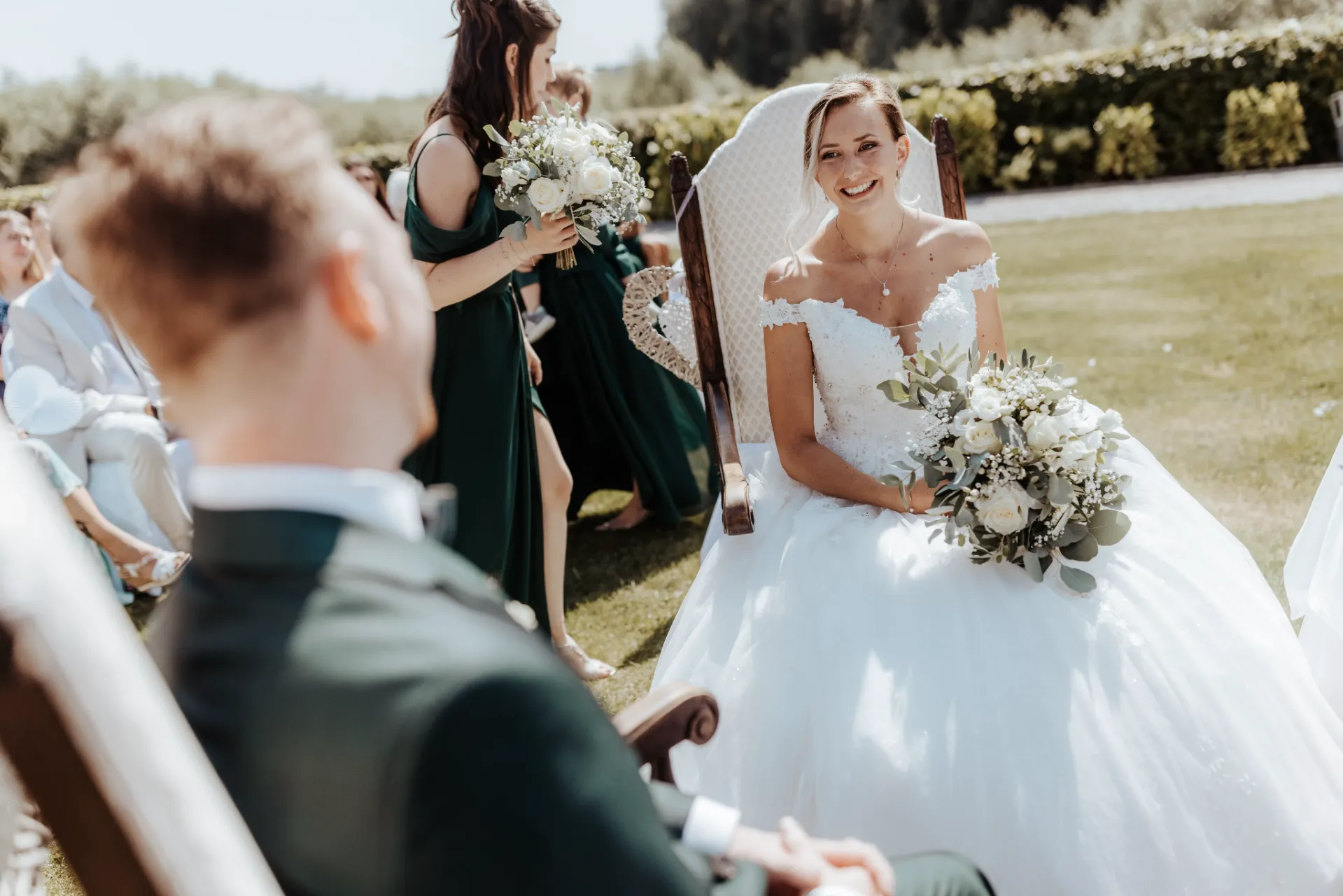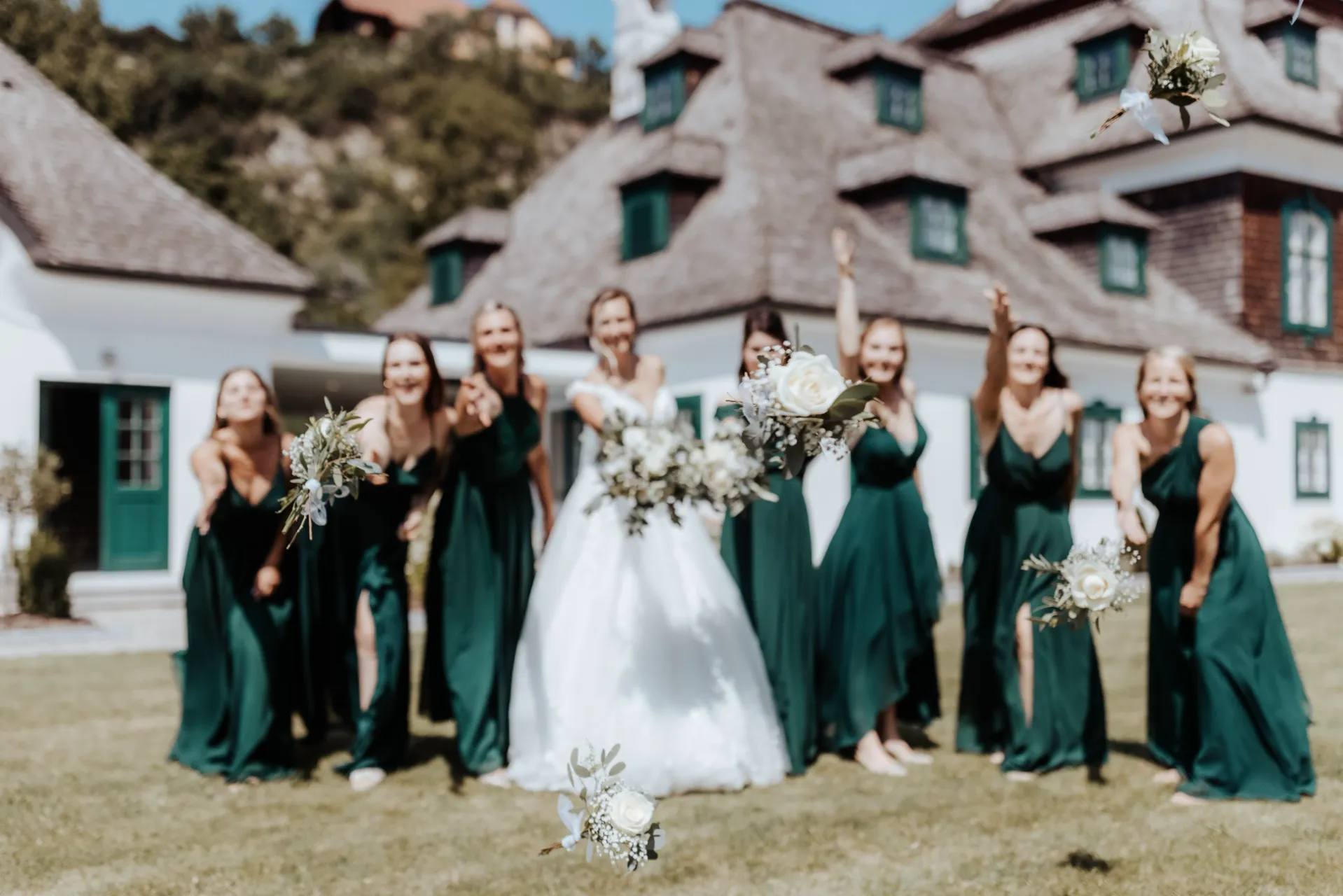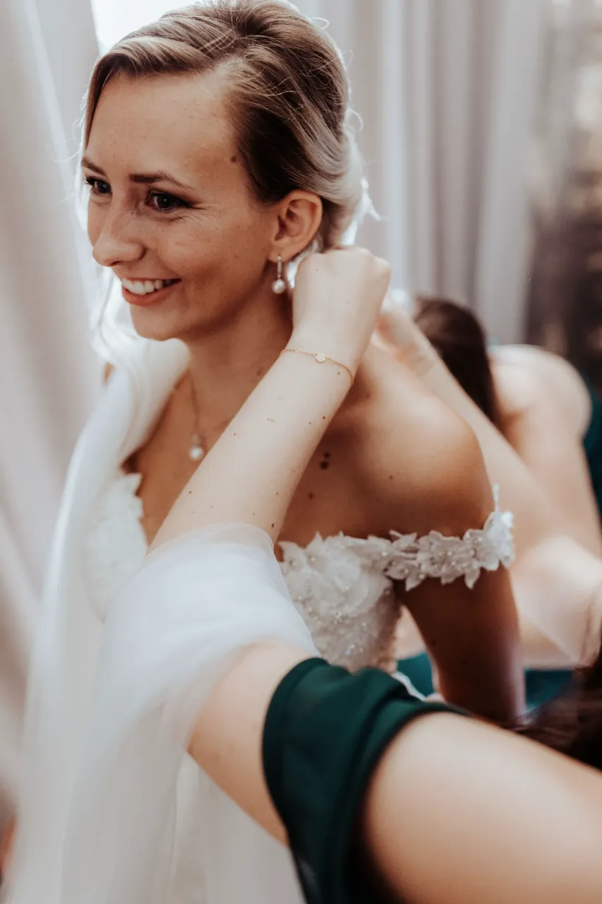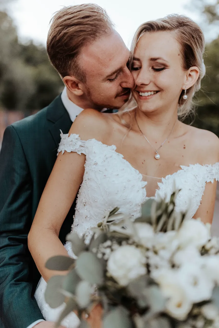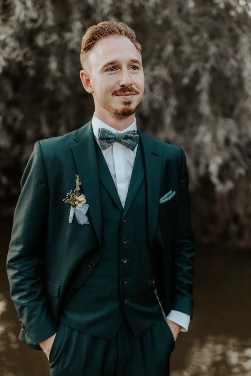 Melanie und Alexander legten besonderen Wert auf die Details ihrer Hochzeit. Die Outfits der Brautjungfern und Groomsmen waren in einem eleganten dunklen Grün gehalten, was hervorragend zur stilvollen Atmosphäre des Schlosses passte. Dieses Farbthema zog sich durch die gesamte Dekoration, die Blumenarrangements und die Kleidung der engsten Freunde und Familienmitglieder des Brautpaares.