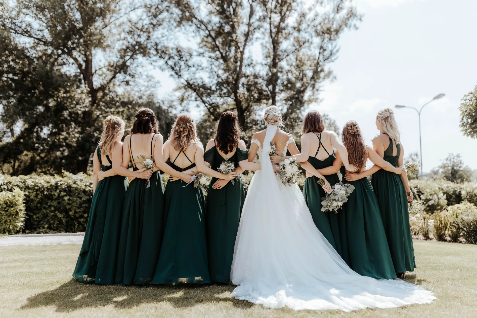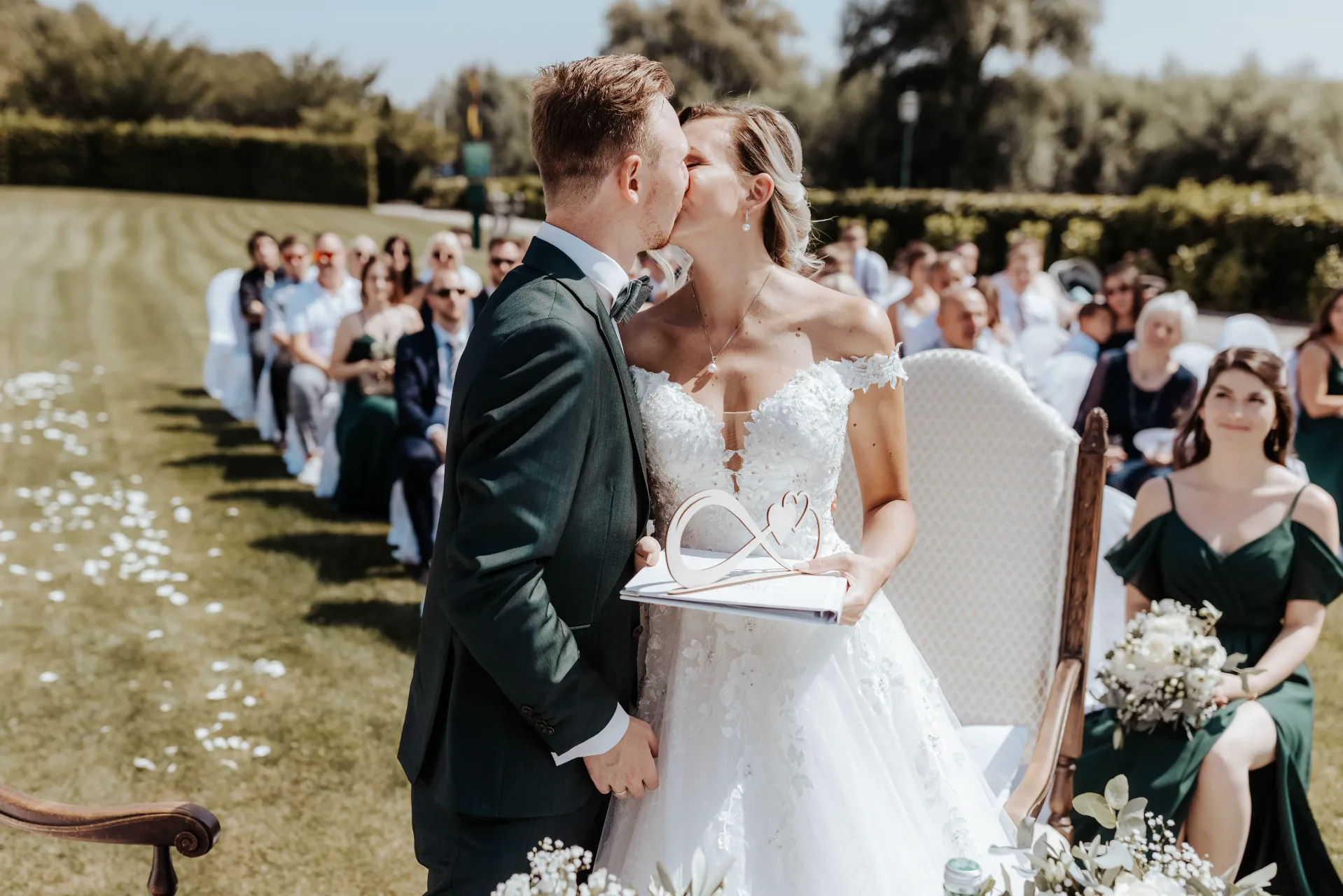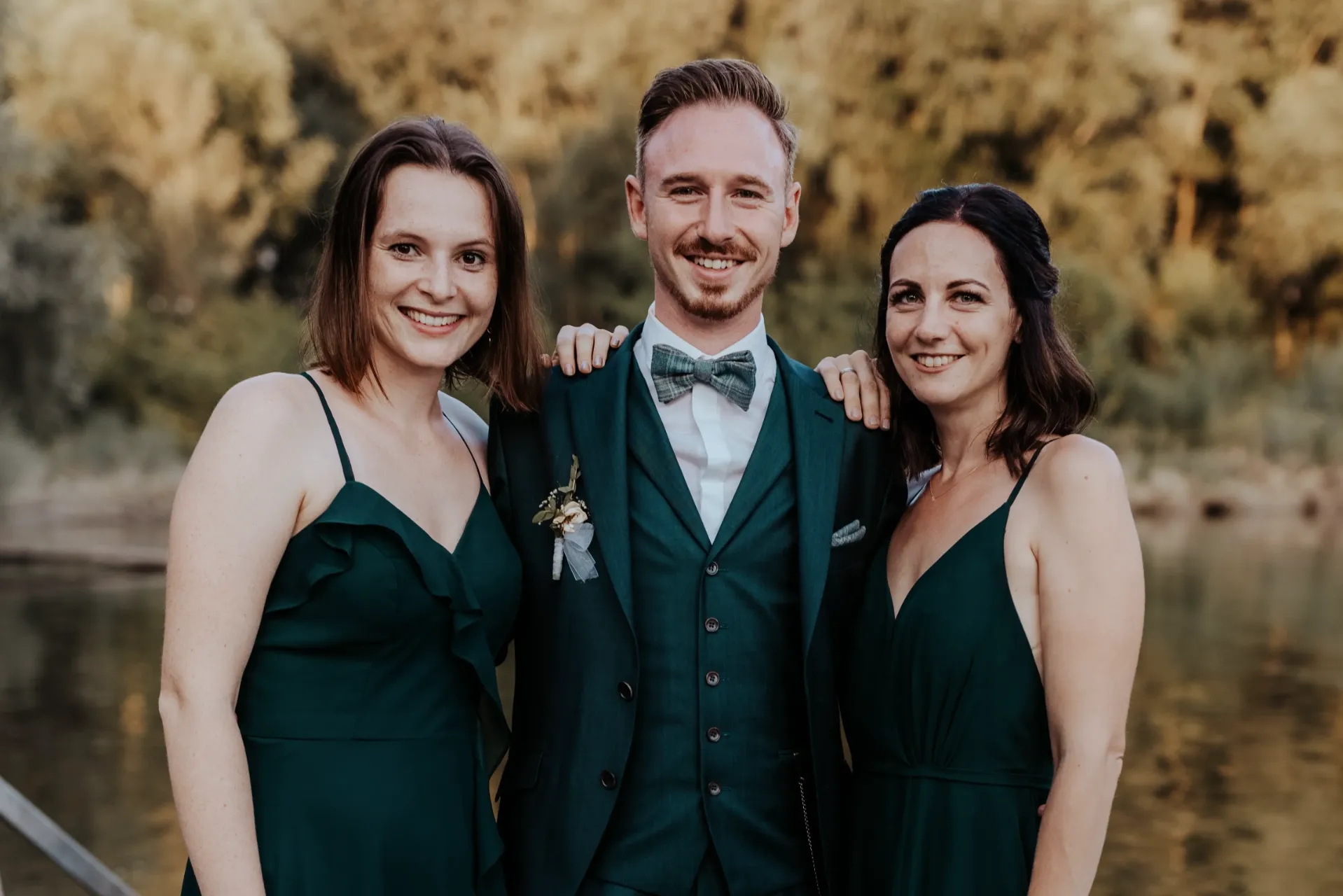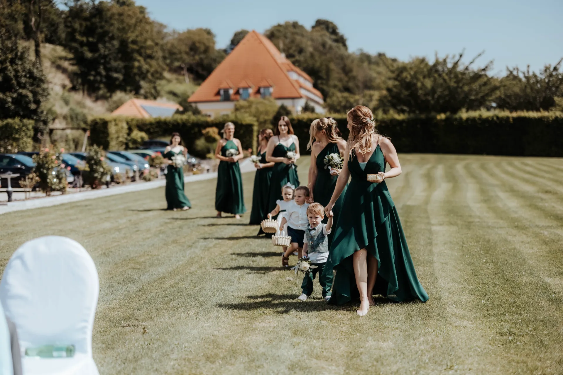 Melanie und Alexander legten besonderen Wert auf die Details ihrer Hochzeit. Die Outfits der Brautjungfern und Groomsmen waren in einem eleganten dunklen Grün gehalten, was hervorragend zur stilvollen Atmosphäre des Schlosses passte. Dieses Farbthema zog sich durch die gesamte Dekoration, die Blumenarrangements und die Kleidung der engsten Freunde und Familienmitglieder des Brautpaares.