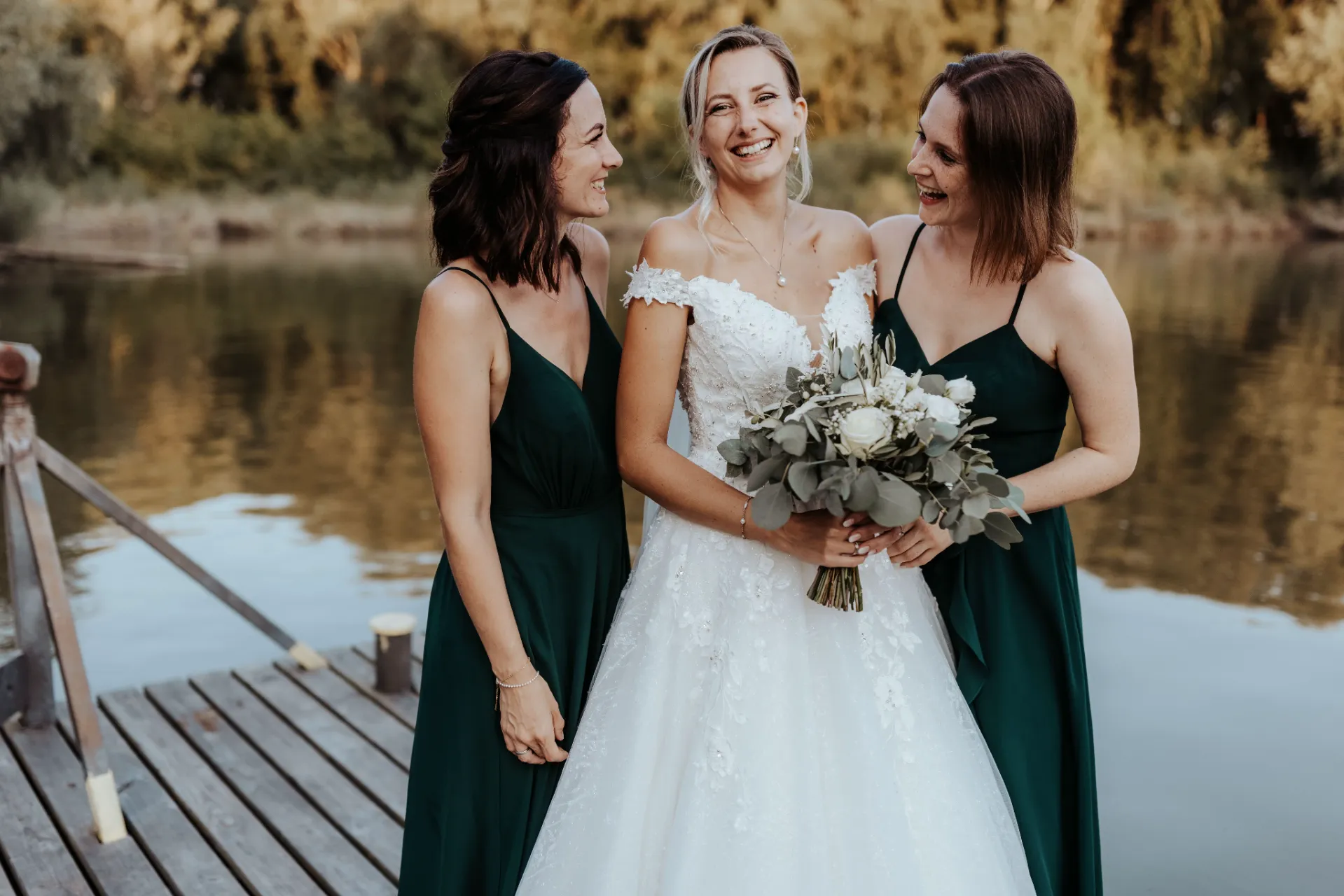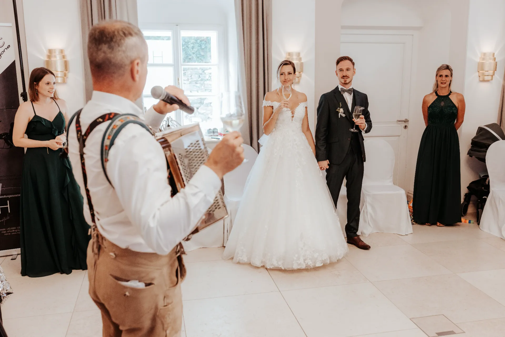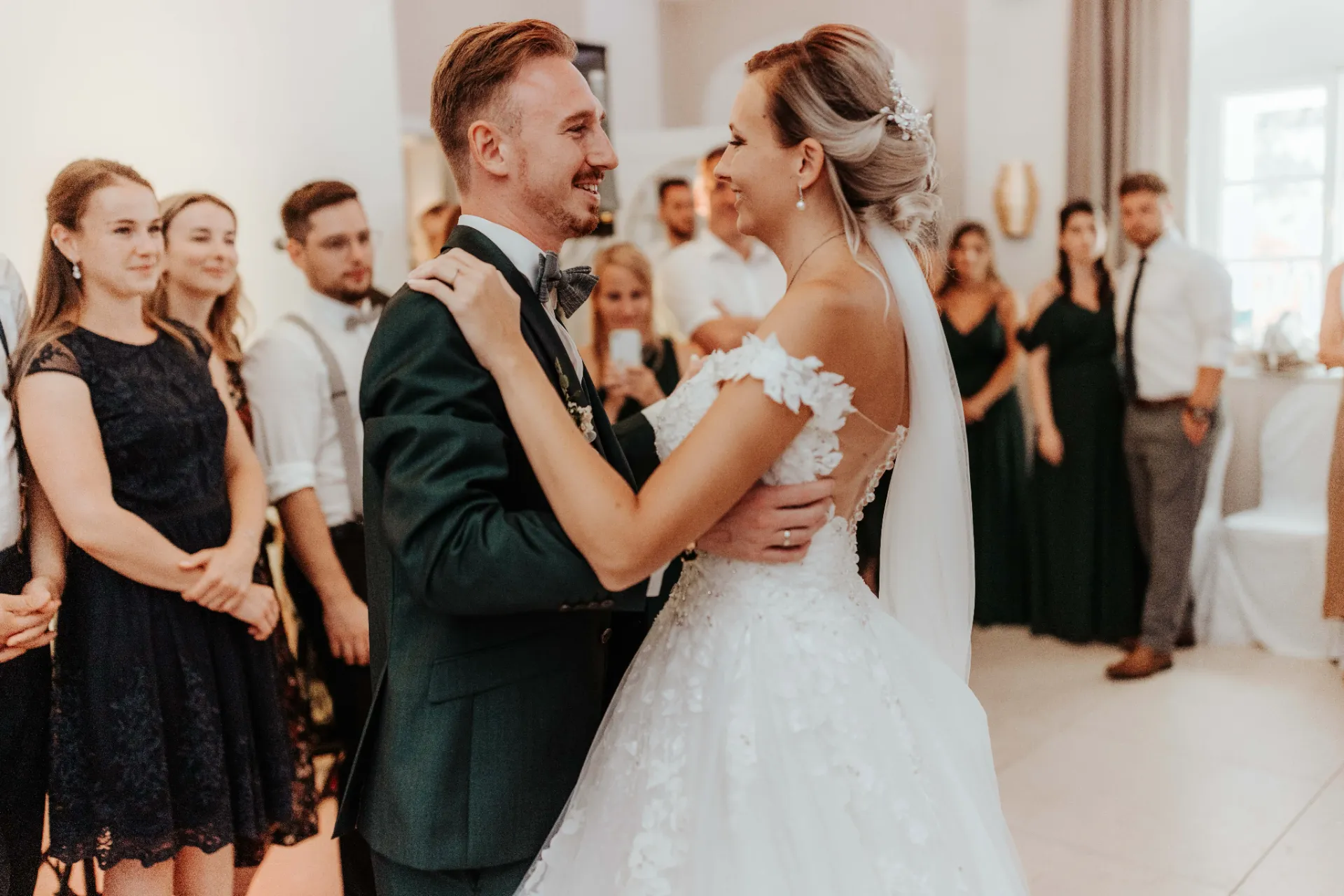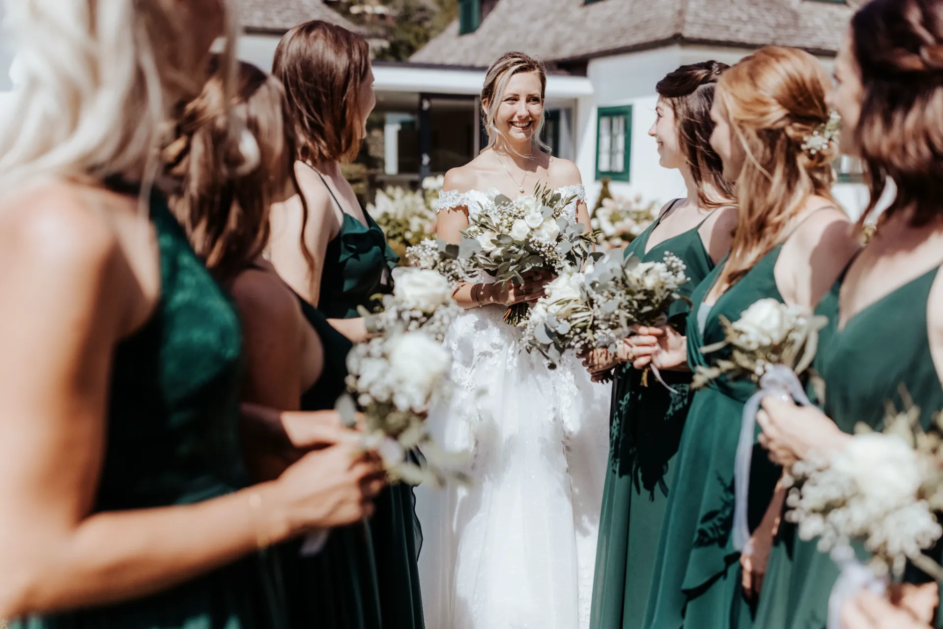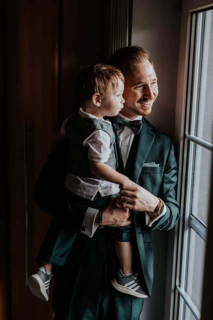 Melanie und Alexander legten besonderen Wert auf die Details ihrer Hochzeit. Die Outfits der Brautjungfern und Groomsmen waren in einem eleganten dunklen Grün gehalten, was hervorragend zur stilvollen Atmosphäre des Schlosses passte. Dieses Farbthema zog sich durch die gesamte Dekoration, die Blumenarrangements und die Kleidung der engsten Freunde und Familienmitglieder des Brautpaares.