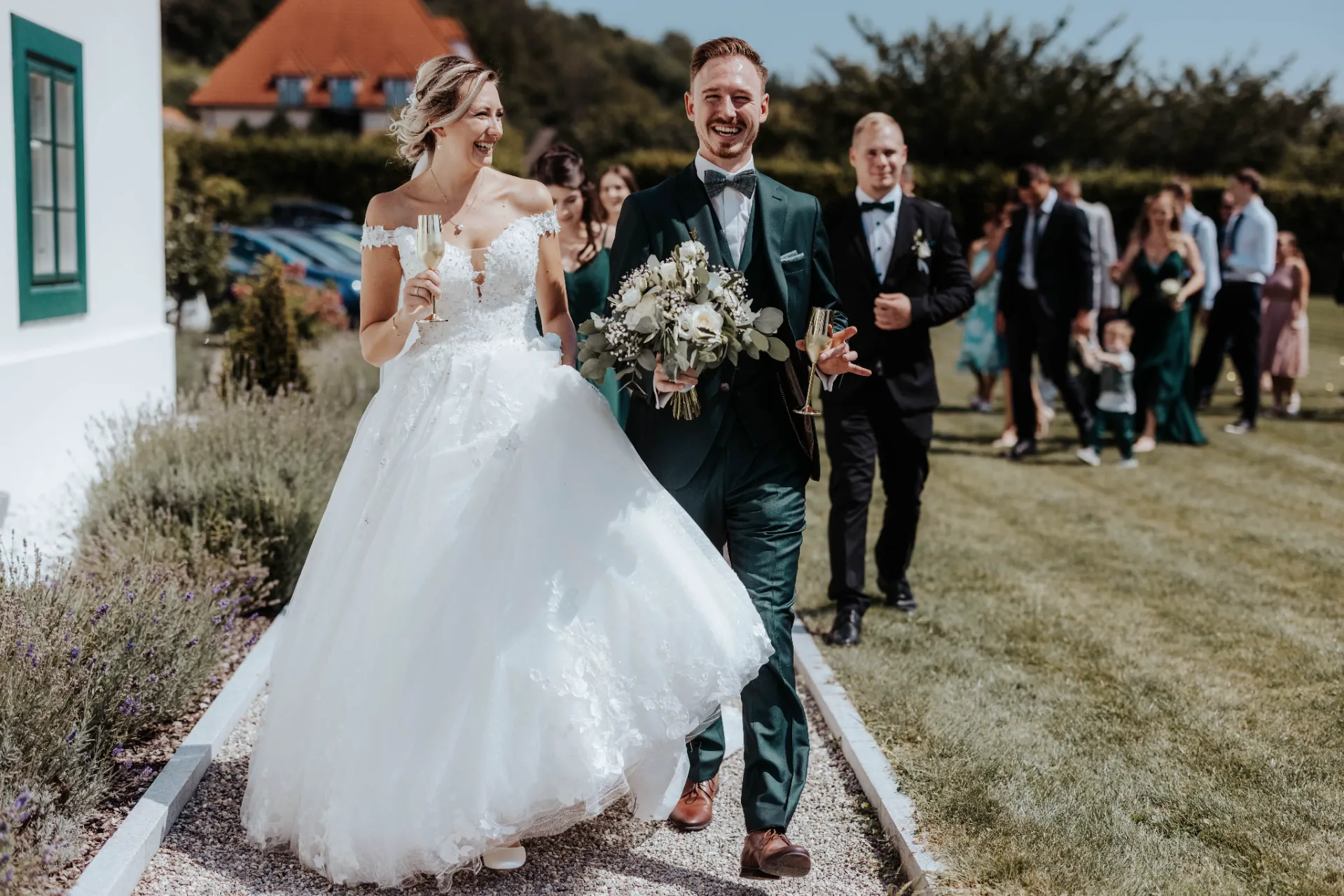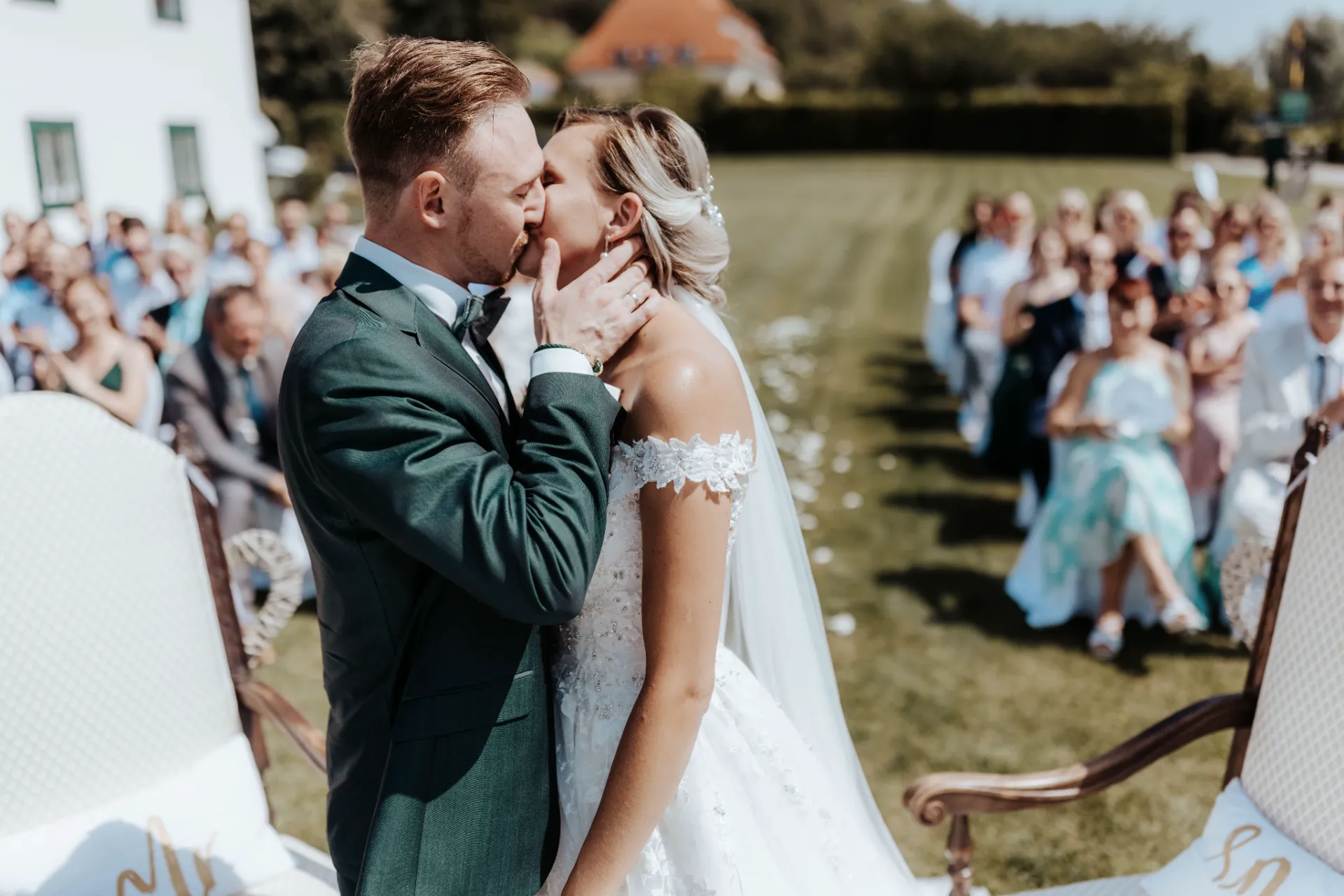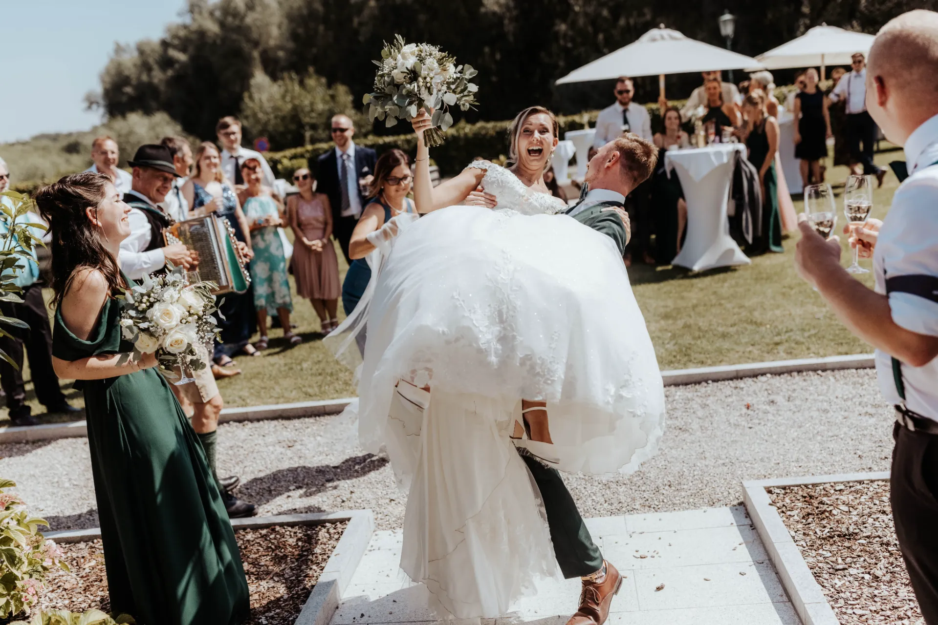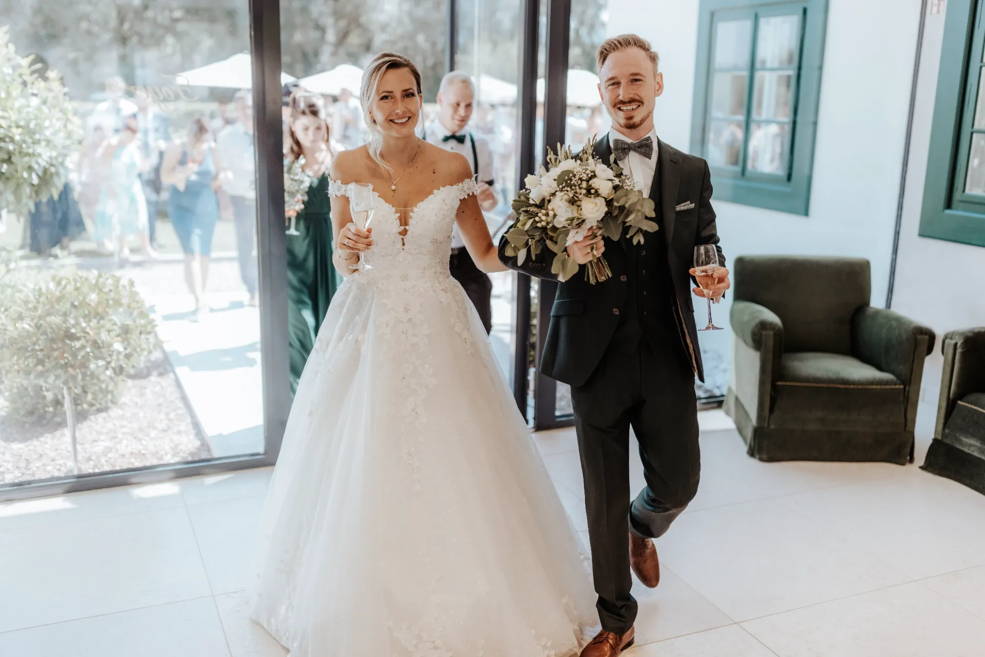 Melanie und Alexander legten besonderen Wert auf die Details ihrer Hochzeit. Die Outfits der Brautjungfern und Groomsmen waren in einem eleganten dunklen Grün gehalten, was hervorragend zur stilvollen Atmosphäre des Schlosses passte. Dieses Farbthema zog sich durch die gesamte Dekoration, die Blumenarrangements und die Kleidung der engsten Freunde und Familienmitglieder des Brautpaares.