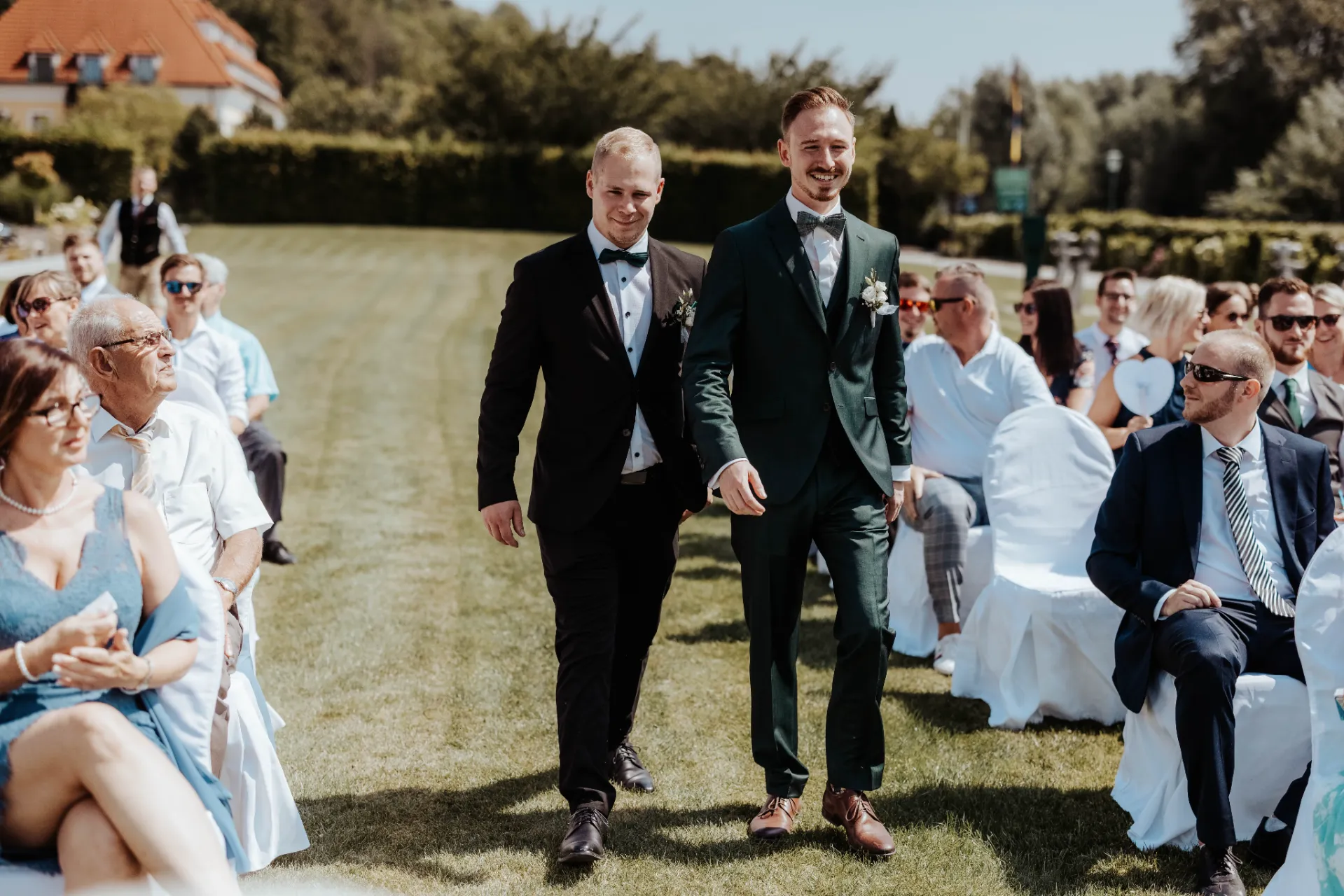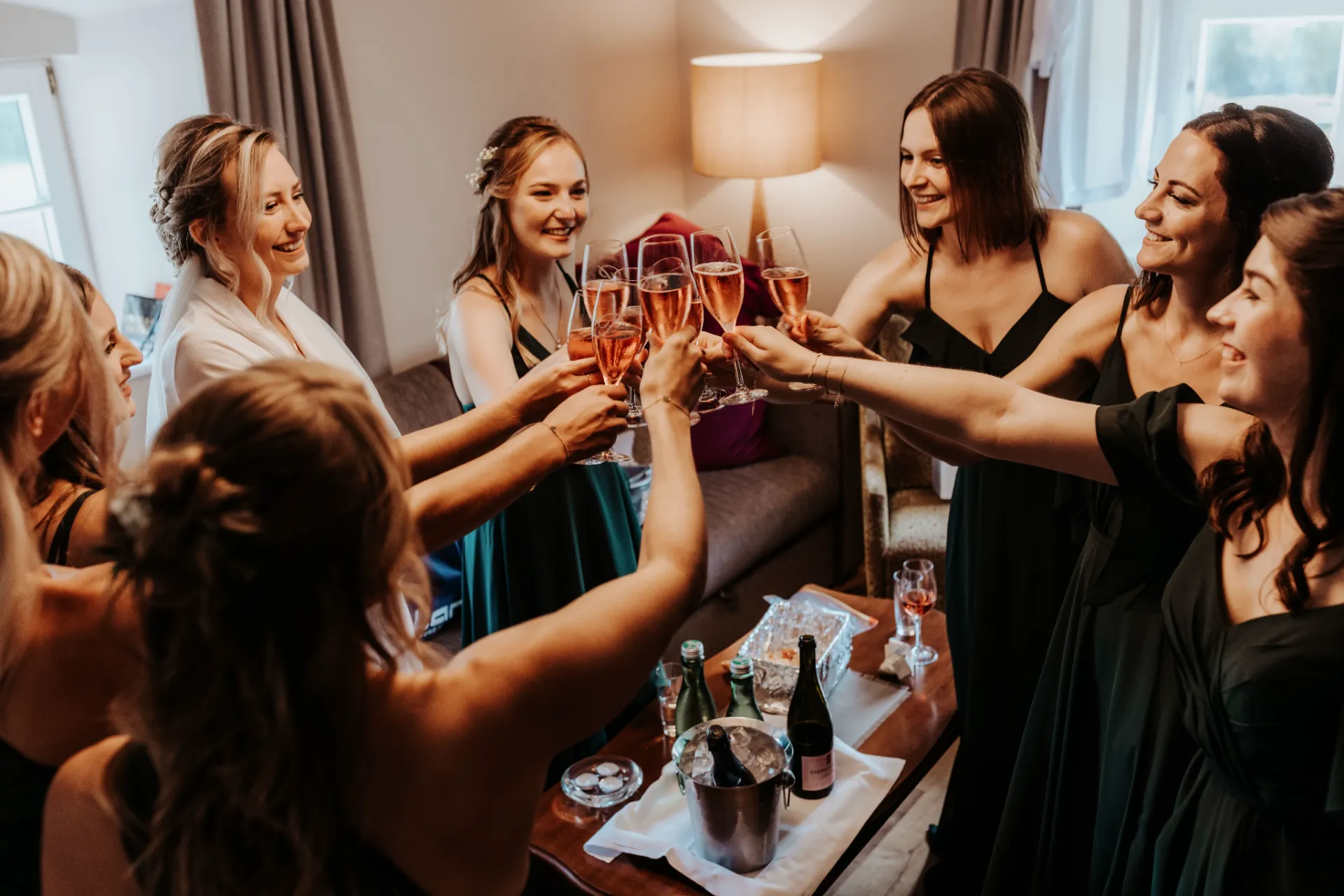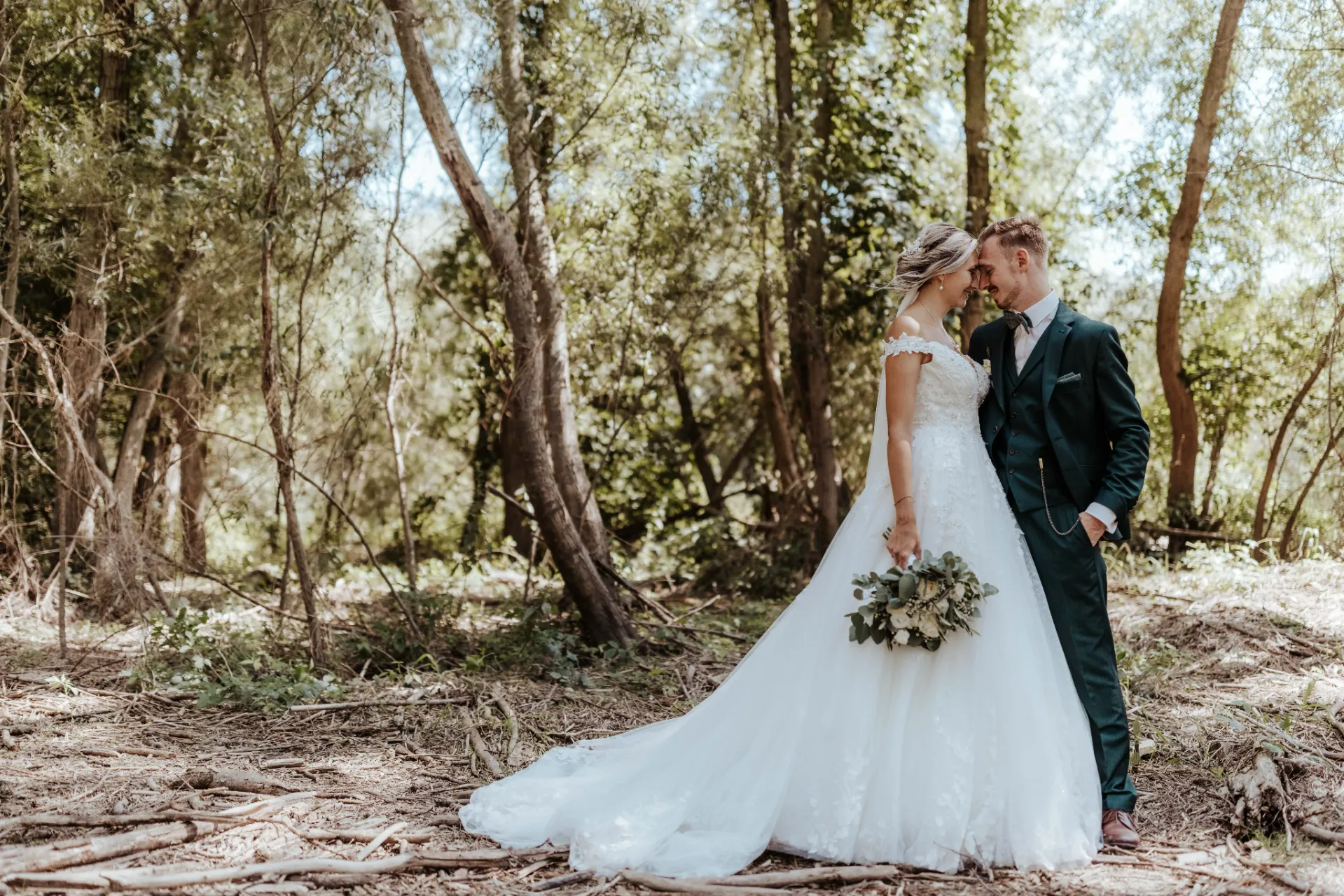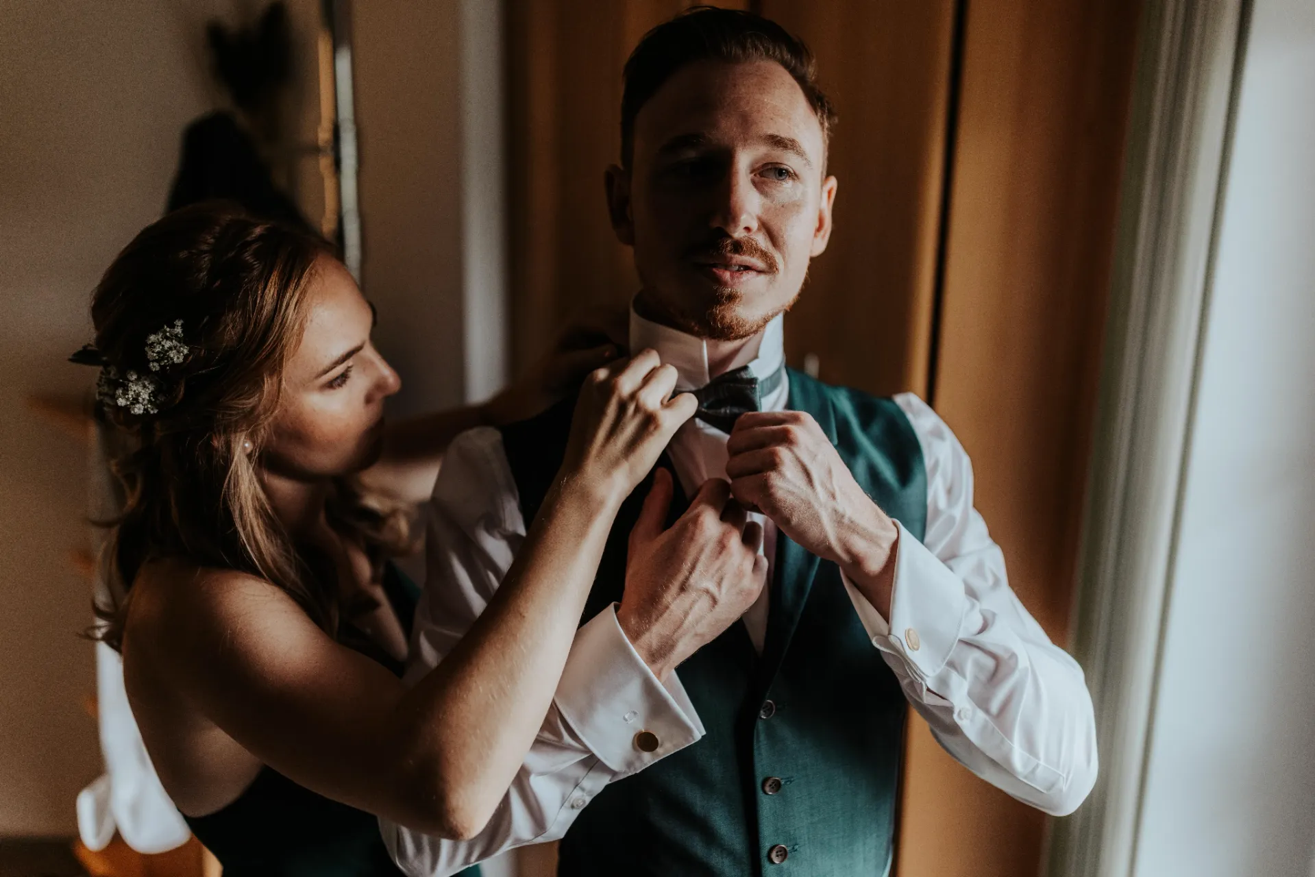 Melanie und Alexander legten besonderen Wert auf die Details ihrer Hochzeit. Die Outfits der Brautjungfern und Groomsmen waren in einem eleganten dunklen Grün gehalten, was hervorragend zur stilvollen Atmosphäre des Schlosses passte. Dieses Farbthema zog sich durch die gesamte Dekoration, die Blumenarrangements und die Kleidung der engsten Freunde und Familienmitglieder des Brautpaares.