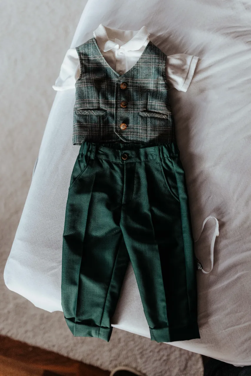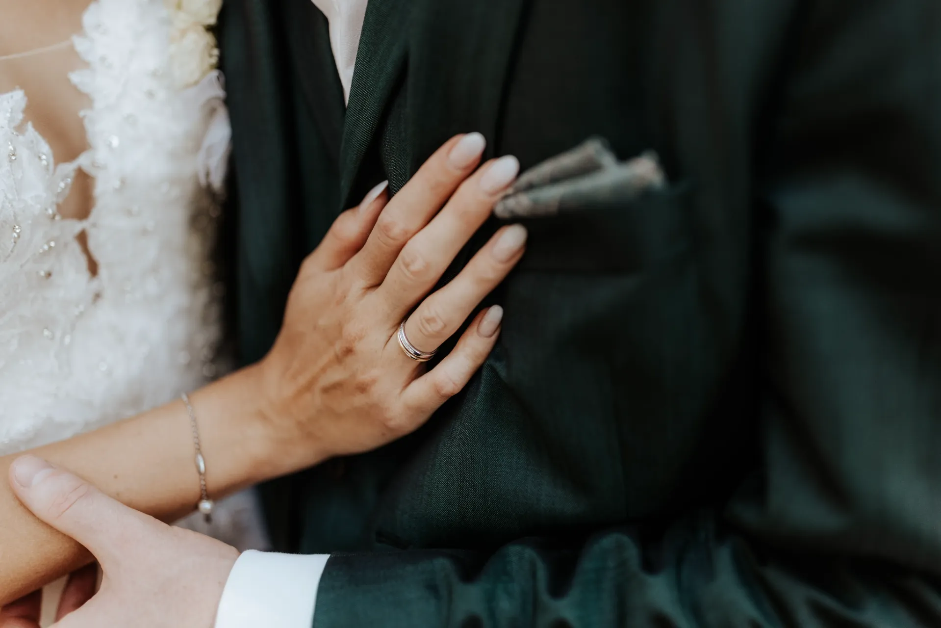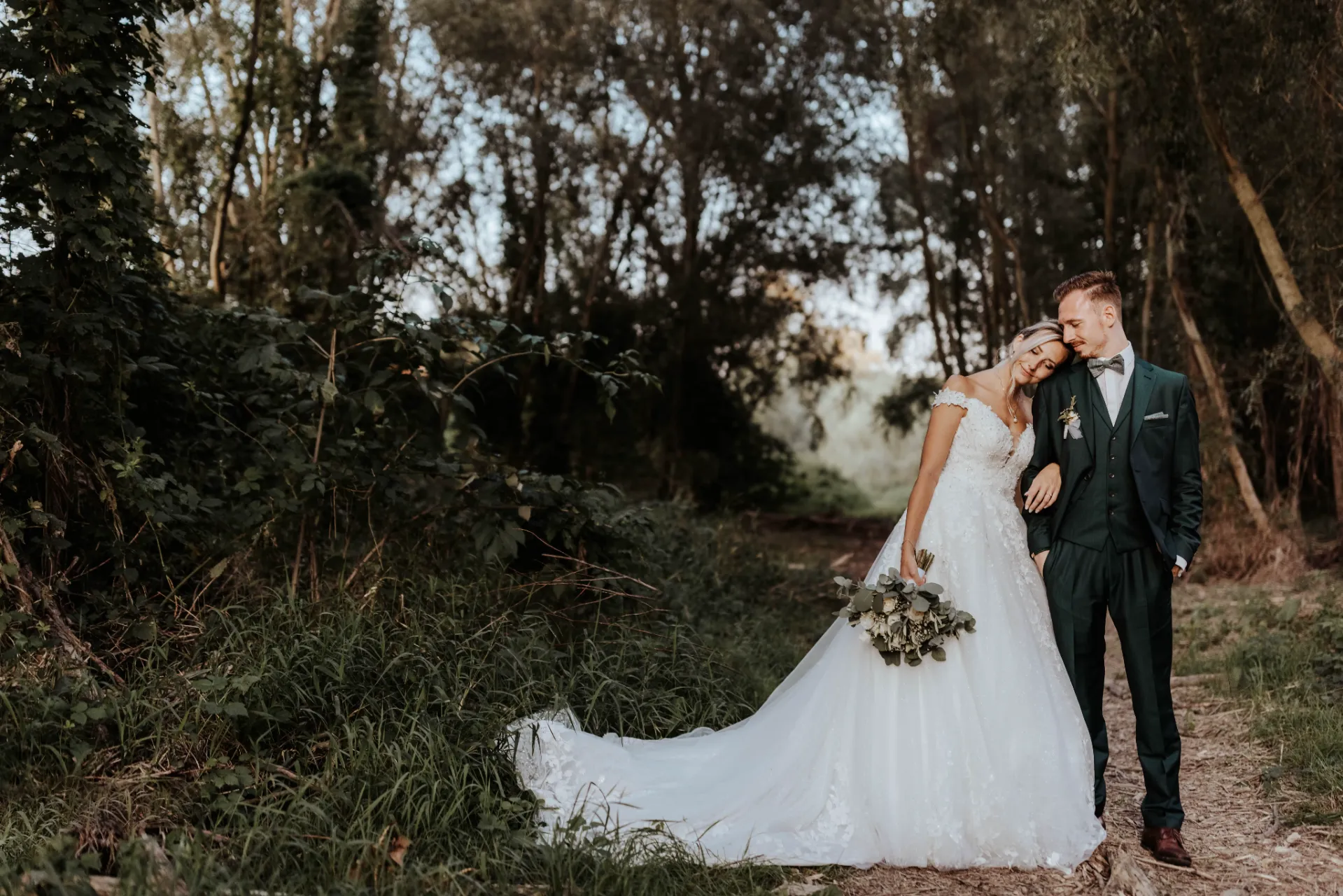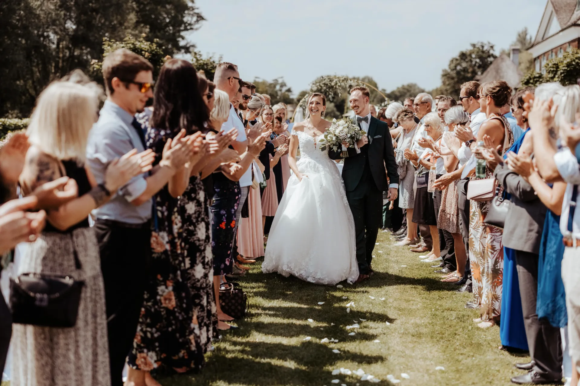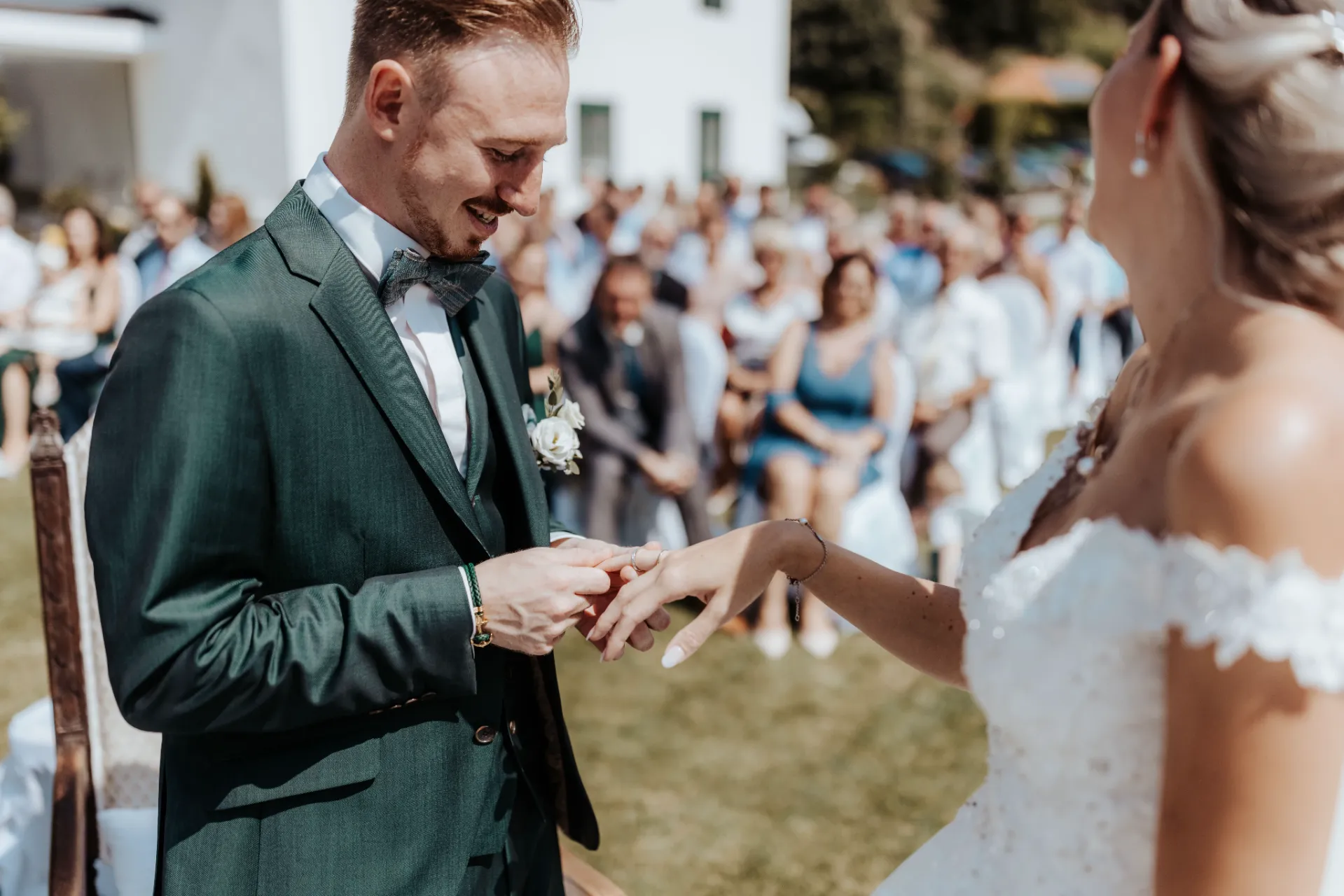 Melanie und Alexander legten besonderen Wert auf die Details ihrer Hochzeit. Die Outfits der Brautjungfern und Groomsmen waren in einem eleganten dunklen Grün gehalten, was hervorragend zur stilvollen Atmosphäre des Schlosses passte. Dieses Farbthema zog sich durch die gesamte Dekoration, die Blumenarrangements und die Kleidung der engsten Freunde und Familienmitglieder des Brautpaares.