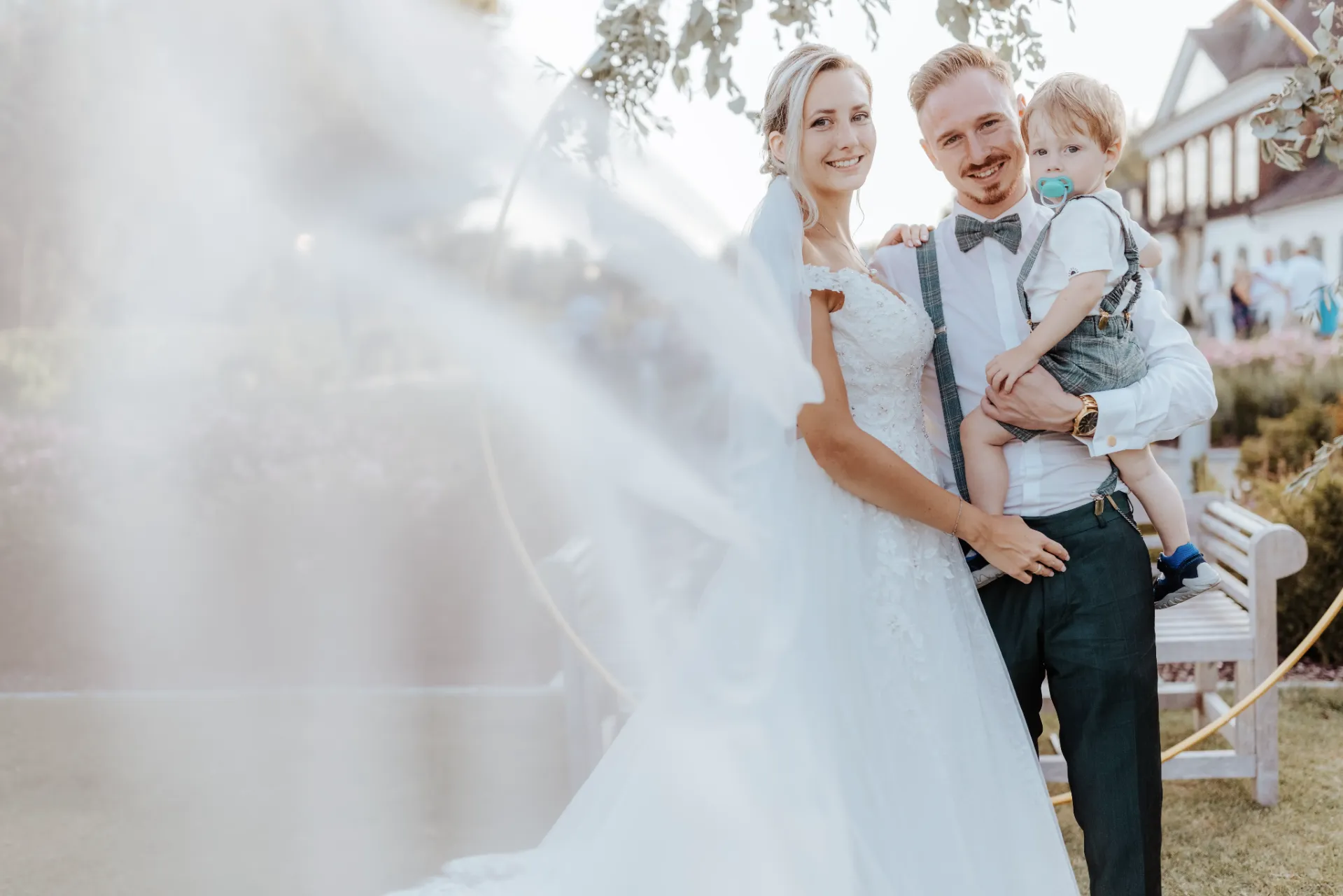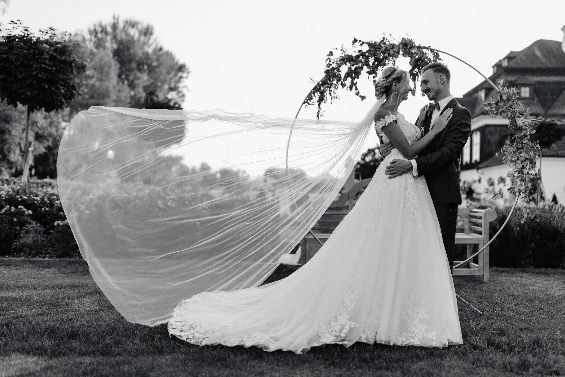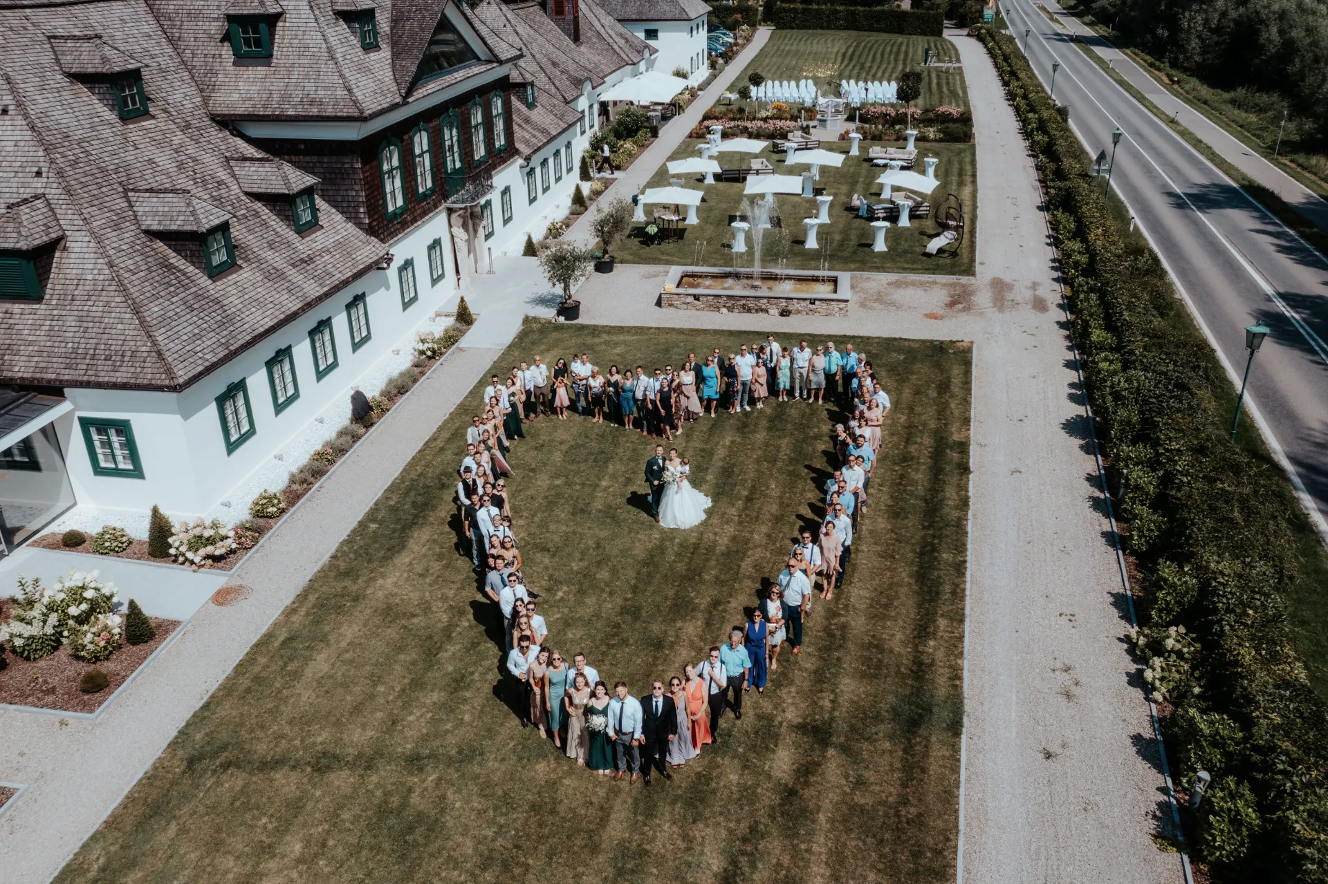 Die sommerliche Abendsonne tauchte die Feier in ein warmes Licht, was die Gruppenfotos besonders strahlen ließ. Die romantischen und eleganten Elemente des Schlosses Luberegg harmonierten perfekt mit den liebevoll ausgesuchten Details der Hochzeit von Melanie und Alexander. Diese Kombination aus natürlichem Licht und durchdachter Dekoration schuf atemberaubende Fotografien, die die Schönheit und Eleganz dieses besonderen Tages einfingen.